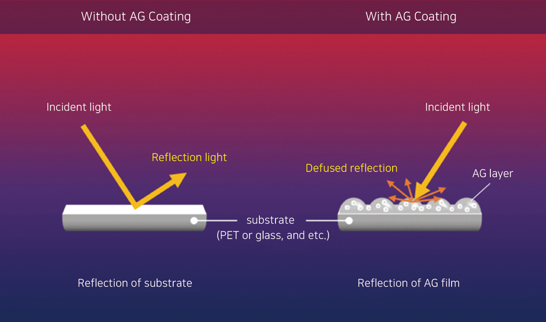 We manufacture high-performance anti-glare film (STAGF) using R2R coating which is microgravure and spray coating. It has an excellent high hardness (9H), flexibility and unique optical property with sparkling free. Also we can materialate and supply STAG film with a controlled haze of the film 5%~60% with the customer's order in mind.