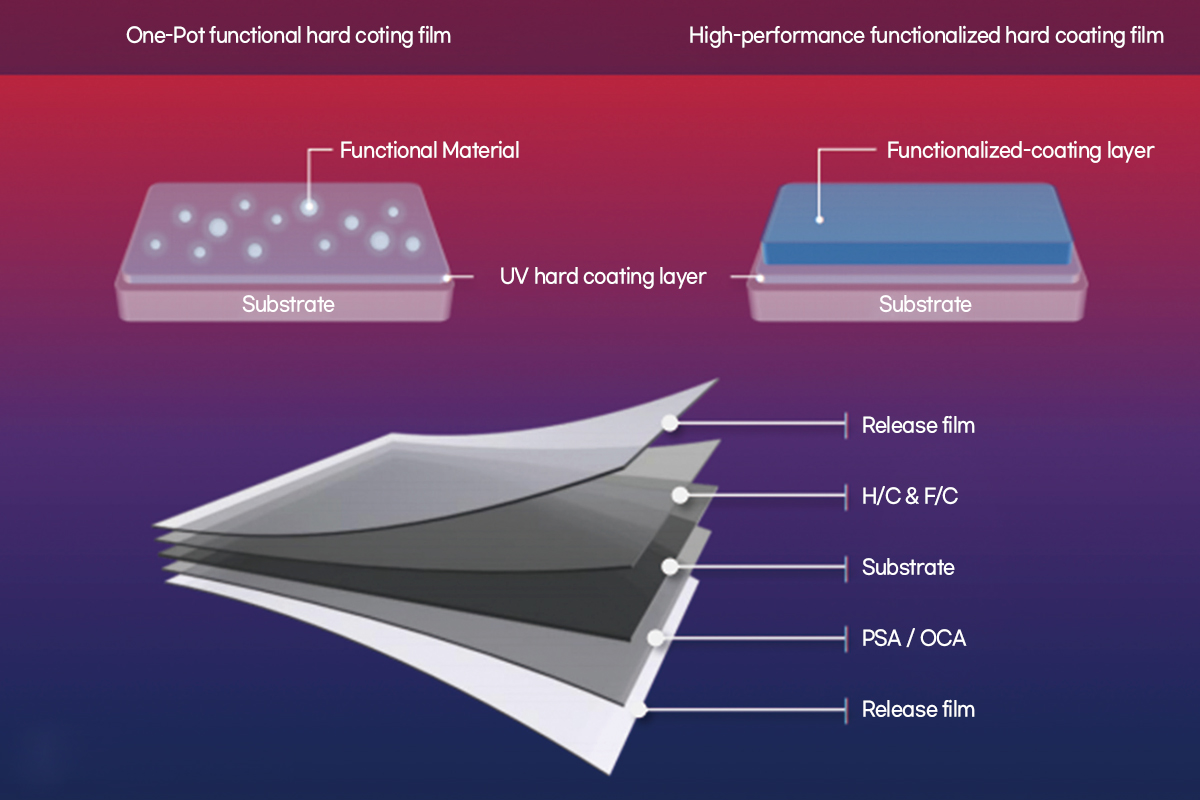 STHD series comprise high hardness coating with protecting various plastic substrate surfaces such as PC, PMMA, PET, PVC, TAC, and CPI applied as UV curable coating solutions It has the best performance of high hardness and highly flexible film designed with the user in mind. It has been easy to control hardness and flexibility by the order.