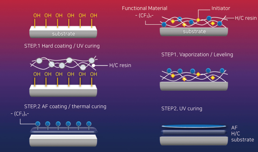 STAF can be applied on the surface of substrates such as glass, plastic, and metal surfaces to improve surface slip, anti-fingerprint and scratch resistance because it is a surface coating with a fluorinated polymer with 20-1000 nanometers thickness. It has excellent water and oil repellency as well as anti-fouling properties with high hardness as a UV curing system And also the STAF coated substrates can be protectively display and are easy to clean.
