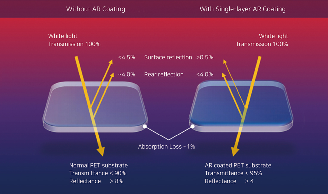 We manufacture high-performance anti-glare film (STAGF) using R2R coating which is microgravure and spray coating. It has an excellent high hardness (9H), flexibility and unique optical property with sparkling free. Also we can materialate and supply STAG film with a controlled haze of the film 5%~60% with the customer's order in mind.